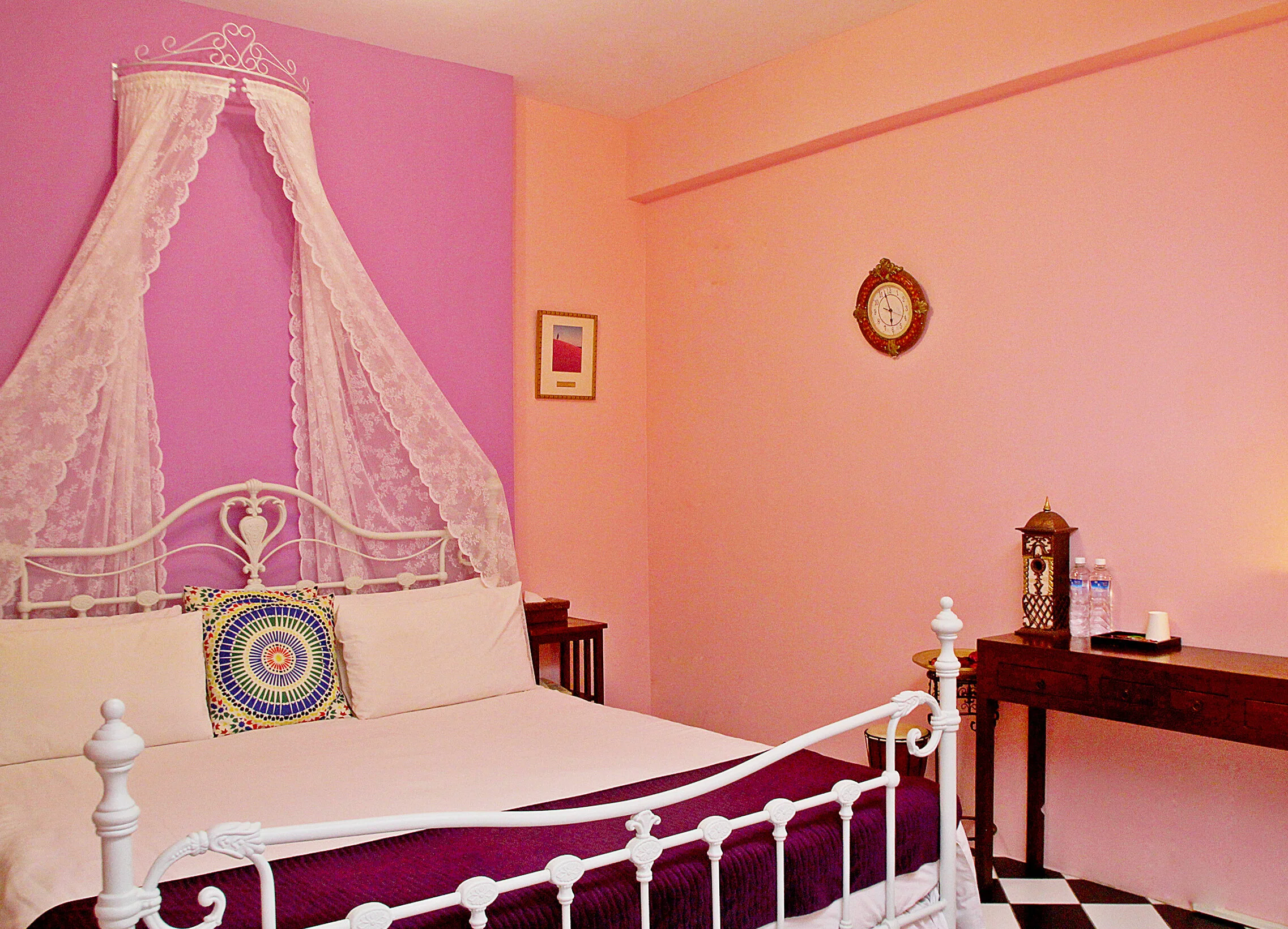 粉紫色的溫柔的包圍著小公主的房間 傳統的黑白菱格摩洛哥地磚